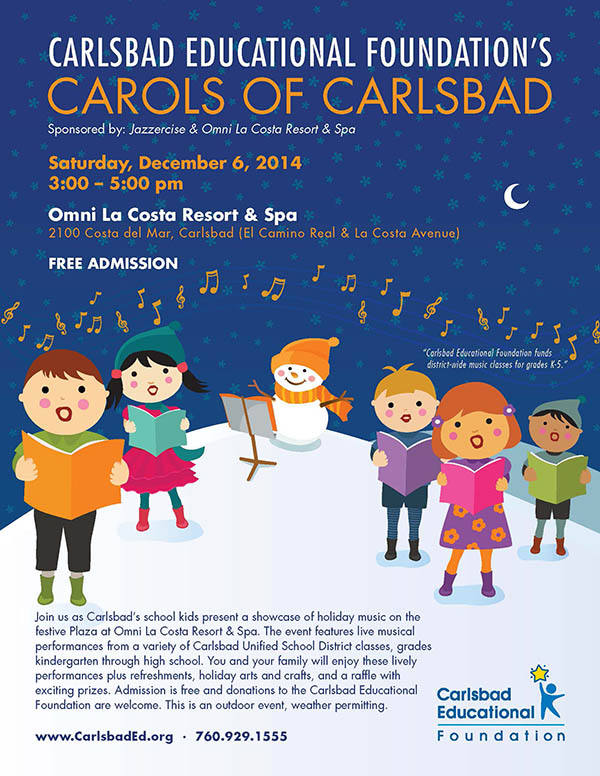 The Carlsbad Educational Foundation’s 5th annual Carols of Carlsbad will be held Saturday, December 6, 2014 at the festive Plaza at Omni La Costa Resort & Spa. This family friendly holiday event proudly sponsored by Jazzercise and the Omni La Costa Resort & Spa features live musical performances from a variety of Carlsbad Unified School District kindergarten through high school students. This is an outdoor event, weather permitting.