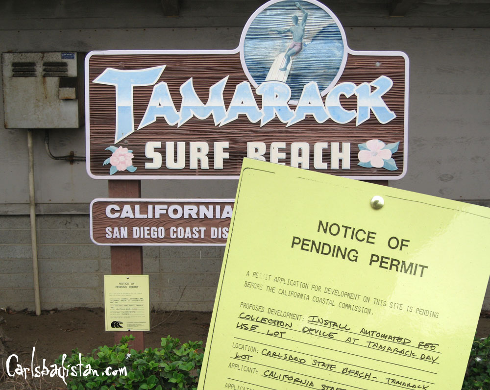 We got a Carlsbadistan news tip this morning letting us know of a notice that was added to the Tamarack Surf Beach sign on November 8. Apparently, California State Parks has filed a permit (#6-07-111) with the California Coastal Commission to install “an automated fee collection device in the Tamarack day use lot.” We know that in the past there have been some issues with the Tamarack parking lot and that the City of Carlsbad has paid tens of thousands of dollars to keep if free.