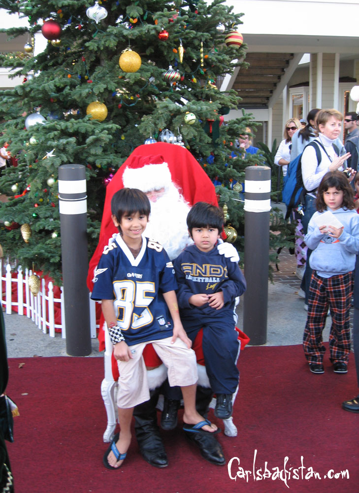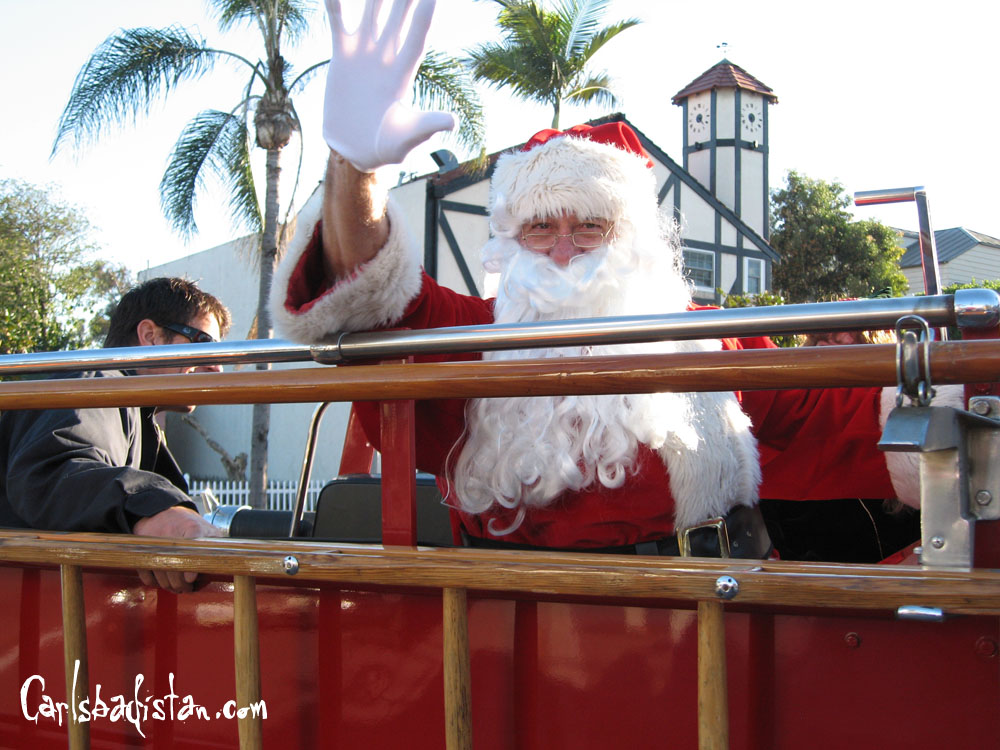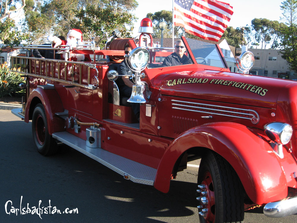 The Carlsbad Fire Department’s classic fire truck had a special passenger this afternoon as hundreds of kids and their parents gathered for the annual Carlsbad Rotary Holiday Tree Lighting ceremony at the Village Faire in the heart of Carlsbadistan. And who was this special rider? It was Santa Claus.