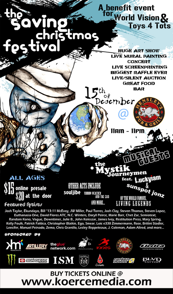 On December 15, 2007 join Koercemedia, Innes, Electra, Sector 9, Sun Diego and more as Hensley’s Flying Elephant Pub and Grill hosts The Saving Christmas Festival, a benefit event for World Vision & Toys For Tots.