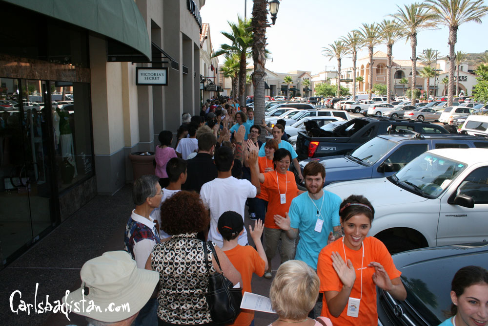 The commotion was distracting regular mall shoppers as they tried to find parking. One attractive woman in big glasses leaned out her window or her black Porsche Cayenne to ask was was going on. When someone told her they were waiting for free T-shirts she couldn’t believe it. “All these people are standing in line for a free T-shirt,” she replied with a look of shock. “I thought all the iPods were 10 percent off or something.”