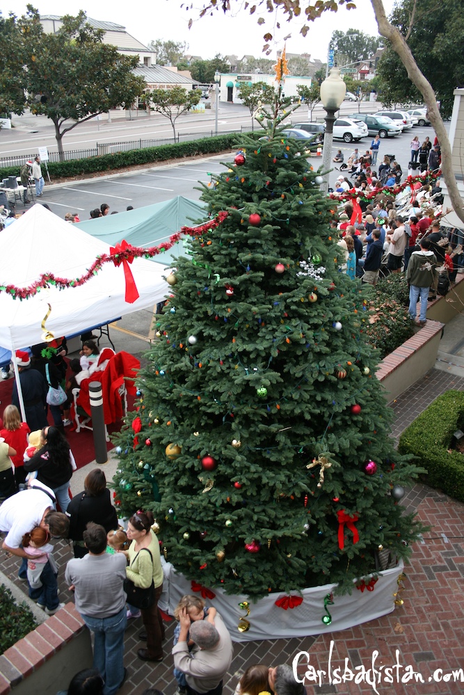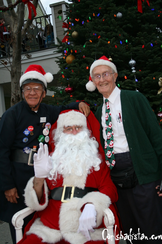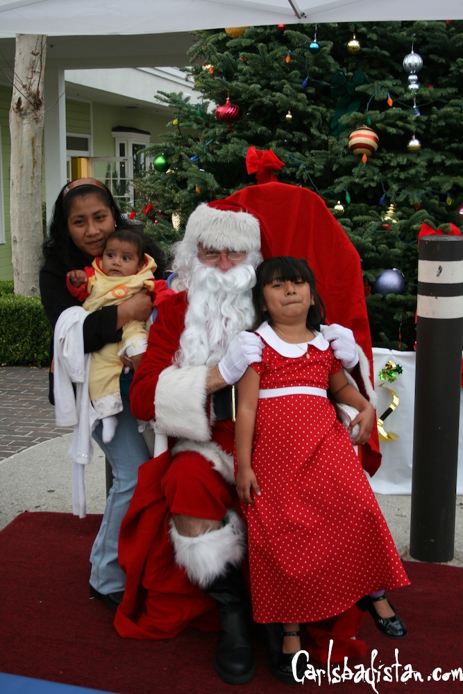 Santa Claus arrived safely in Carlsbadistan Sunday, December 7, 2008 at the annual Rotary Christmas Tree Lighting ceremony at The Shops at Village Faire. The crowds turned out, and the festivities got underway at 2 pm with Santa’s arrival. It was an afternoon of free cider, cookies, and a Christmas card craft station for the hundreds of kids who showed up with their parents on the blustery day.