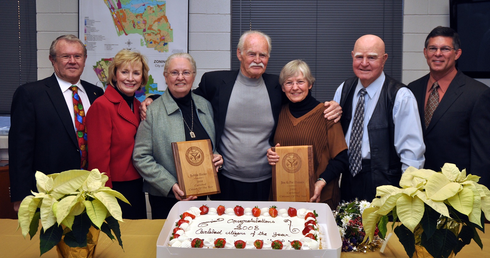 Pictured from left: Carlsbad City Council Member Matt Hall; Mayor Pro Tem Ann J. Kulchin; 2009 Citizens of the Year Bobbie Hoder; Jim Hansen and Pat Hansen; Mayor Claude A. “Bud” Lewis; and Council Member Keith Blackburn.