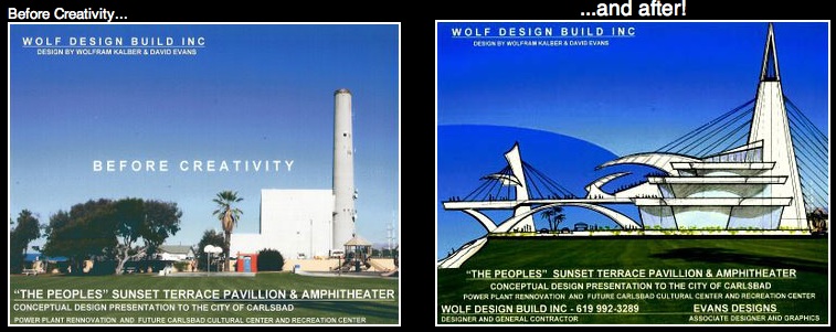 Kalber’s most recent work in Carlsbadistan is the $17 million Kiko Beach House on Ocean St. which we last featured in our 12 Days of Carlsbadistan Christmas. Now, Kalber and David Evans have some ideas for the Encina Power Station property. It’s called The Peoples Sunset Terrace Pavillion & Amphitheater. The structure which houses a Carlsbad Cultural Center and Recreation Center, looks somewhat like Denver’s DIA airport.