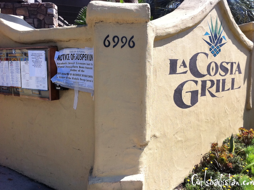 A State of California Alcoholic Beverage Control notice posted near the front door of Carlsbadistan’s La Costa Grill says the “Alcoholic Beverage License Issued for these premises has been suspended. . . for violation of the Alcoholic Beverage Control act.”