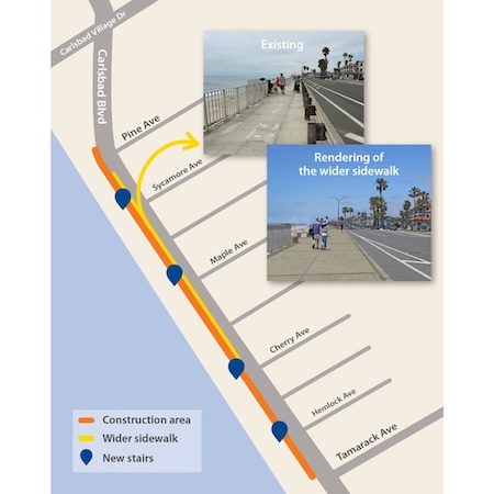 The City of Carlsbad has announced they will soon begin a construction project on the upper sidewalk on Carlsbad Boulevard from Pine to Cherry Streets which sees them removing the protective guardrail that has made this stretch of sidewalk a favorite for walkers and stroller pushers for decades.