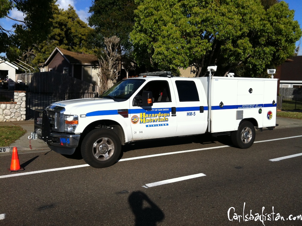 Carlsbad Police had Tyler and Roosevelt Streets closed between Pine Ave. and Chestnut Ave. in the mid afternoon and had still not opened at 5:30 PM while Carlsbad Fire Department Hazardous Material crews worked to clean up. For more photos, follow the jump.