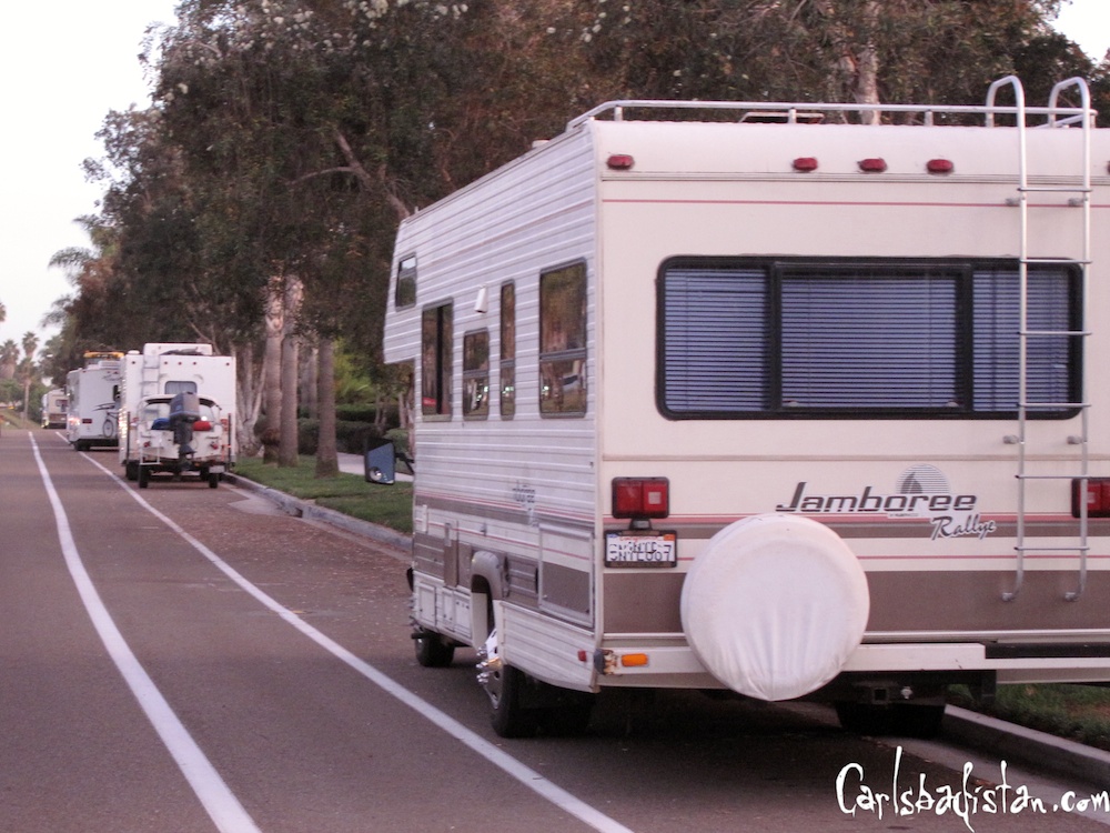 I total agree with Bernadette, it’s about time. That picture was taken near my home and these things have become the scourge of Avenida Encinas. I occasionally count them when I’m driving that street between Poinsettia and Palomar Airport Rd. and have counted upwards of 25 RV parked in that area. Have felt sorry for those that live along there having to deal with the “campers” in their neighborhood.