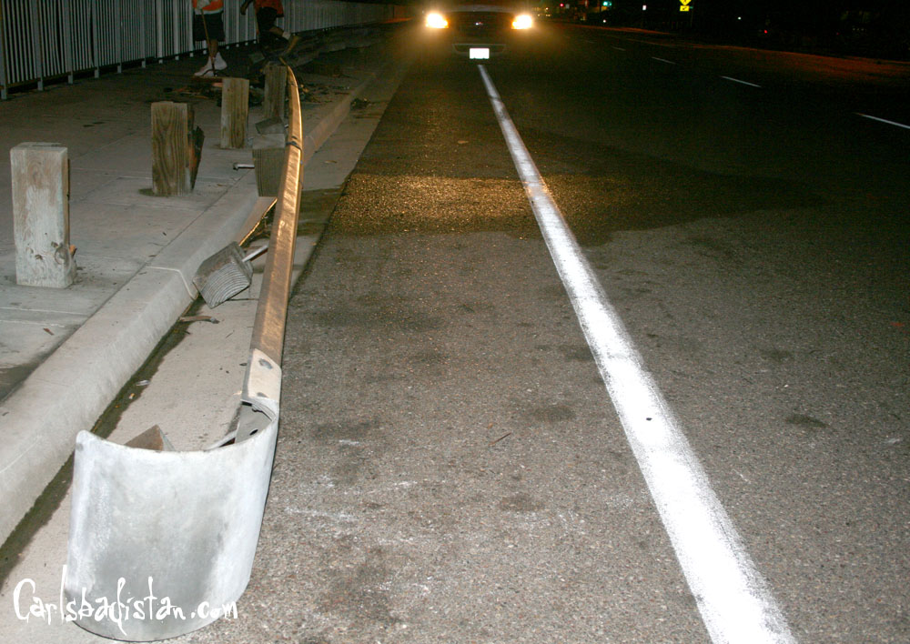 This evening at approximately 10 PM a vehicle plowed through the guard rail on the seawall at Carlsbad Boulevard and Chestnut ripping out approximately 50 feet of railing. Luckily, no pedestrians appear to have been hurt. The car was hauled away by a tow-truck. By 11 PM crews were out cleaning up the mess enough for people to walk and drive by.